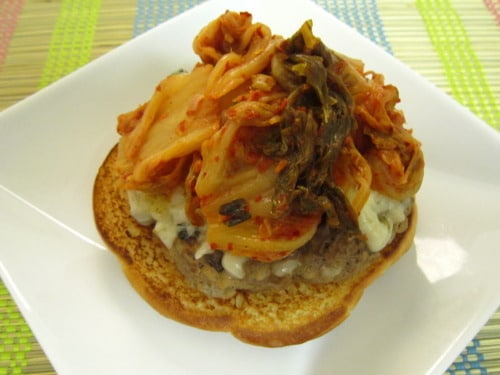 Meanwhile, grill the buns, cut side down, for 1 minute, until toasted. Place burgers on buns and top with grilled kimchi, if desired, and serve hot.
