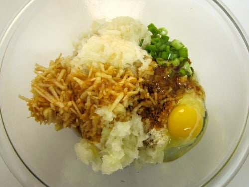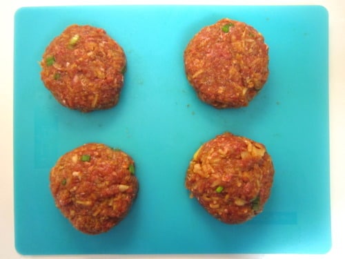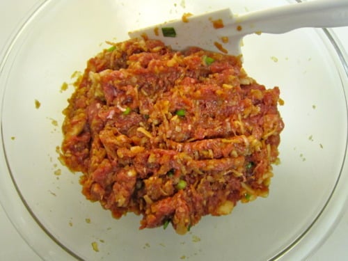 Carefully mix beef, garlic, ginger, onion, apple, pear, soy sauce, sesame oil, honey, green onion, egg and panko bread crumbs. (Do not mash them.)