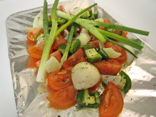 Place sliced tomatoes onto center of baking sheet. Add separated pieces of onion, green onion and jalapenos on and around tomato. Place garlic slivers inside the tomato halves (this protects them from burning while still allowing them to infuse the tomatoes with the garlic flavor). Drizzle olive oil all over mixture. Add salt and pepper, to taste.
