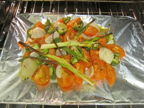 Place in oven and roast until tomatoes are soft and juicy and the onions are tender, about 20 minutes.