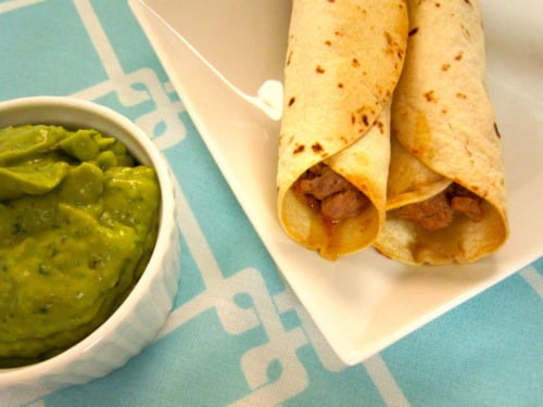 Pork Tenderloin, Caramelized Onion, and Monterey Jack Baked Flautas with Spicy Avocado Sauce