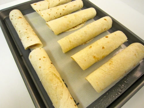 Place into the oven and bake for 8-10 minutes. Turn over flautas and cook for an additional 5-6 minutes, or until crispy and golden brown.