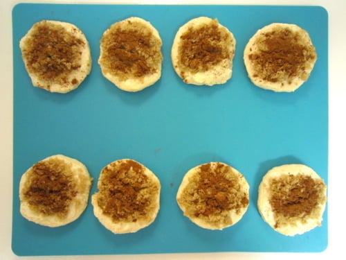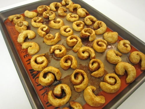Use a sharp knife and cut 1/2-inch slices and place onto prepared baking sheet. (I cut 5 slices per biscuit making 40 small cinnamon rolls.)