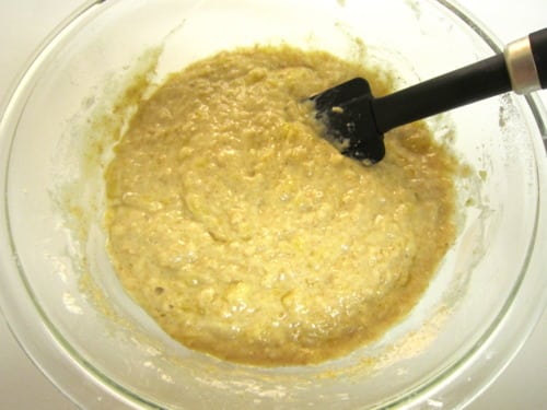Sift flour mixture over banana mixture and stir using a rubber spatula just until moist.