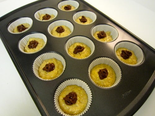 Scoop a spoonful of batter evenly into the muffin tray. Drop 1-2 teaspoons of Nutella into the center of each cup. (I highly recommend using a squeeze bottle for this.)
