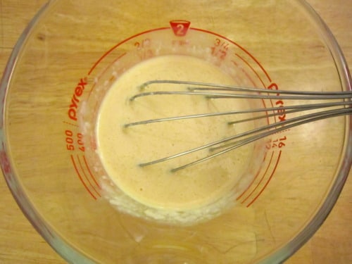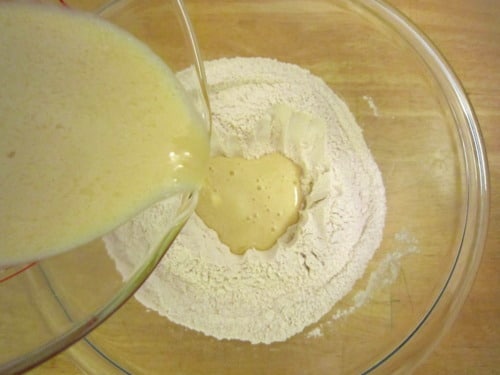 In a large glass measuring cup or another bowl, whisk together the buttermilk, egg, maple syrup, butter and vanilla.