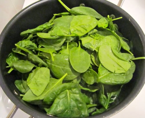 Heat 3 tablespoons water in a saucepan over high heat. Add the spinach and shake the pan until spinach has wilted; drain well.