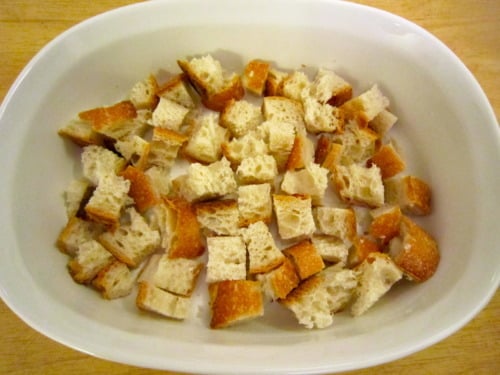 Layer the bottom of the baking dish with one third of the bread cubes.