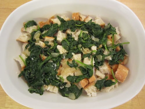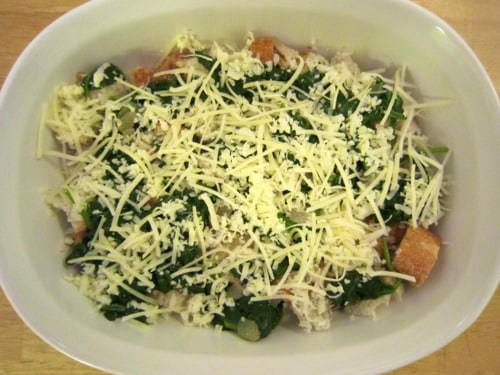 Top with one third of each of the cheeses. Repeat 2 more times with bread cubes, spinach mixture, and each of the cheeses.