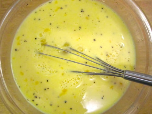 In a large bowl, whisk together the eggs, milk, remaining ½ teaspoon salt and pepper, to taste.