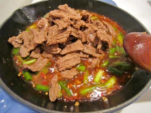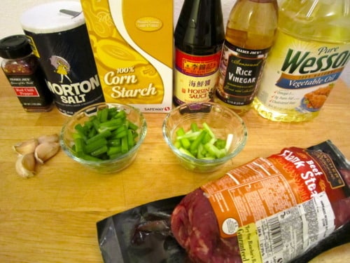 - 1 1/4 pounds flank steak, cut diagonally across the grain into 1/2-by-3-inch strips