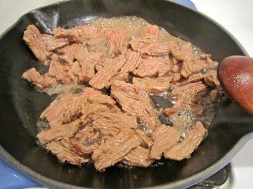 Heat 1 tablespoon oil in a skillet over high heat. Working in two batches, add the steak and cook until lightly browned, turning once, about 2 minutes. Transfer to a plate.