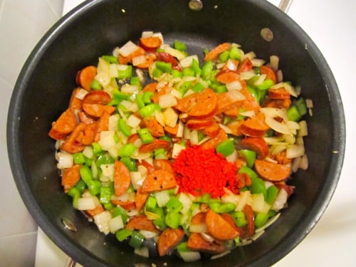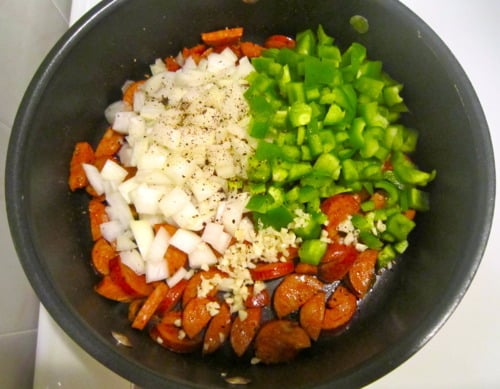 - 6 ounces andouille sausage, halved lengthwise and sliced into 1/4-inch-thick pieces
