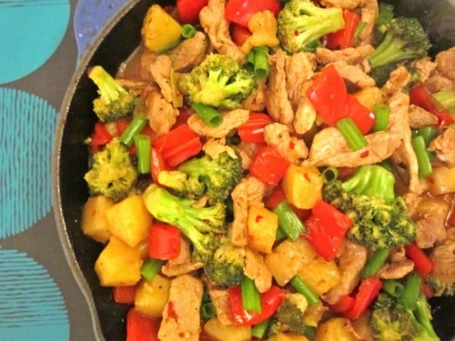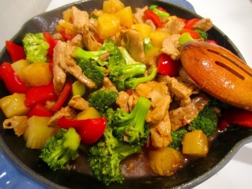 Like the Beef and Scallion Stir-Fry, this is another dish that’s not only faster than Chinese take-out but tastes better than take-out. The only thing I would actually change though is to cook it in a large saucepan versus a skillet since there were just to many ingredients to fit in the skillet. But other than that, it was a delightful dish that was both savory and sweet with plenty of vegetables and chunks of juicy pineapples throughout in a nice thick and creamy sauce.