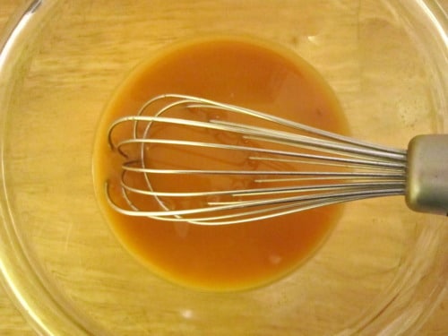In a small bowl, whisk together 1/3 cup pineapple juice, vinegar, soy sauce, cornstarch and 1/4 cup water. Season with salt and pepper, to taste; set aside.