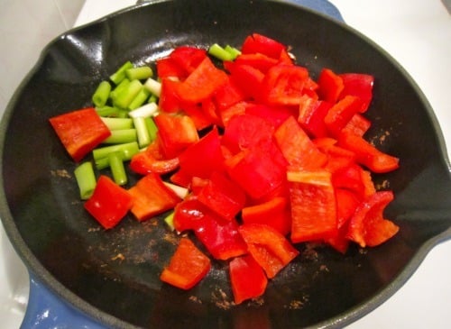 Add the scallion whites and bell peppers to the skillet; season with salt and pepper, to taste. Cook, stirring, until peppers are crisp-tender, about 6-8 minutes.