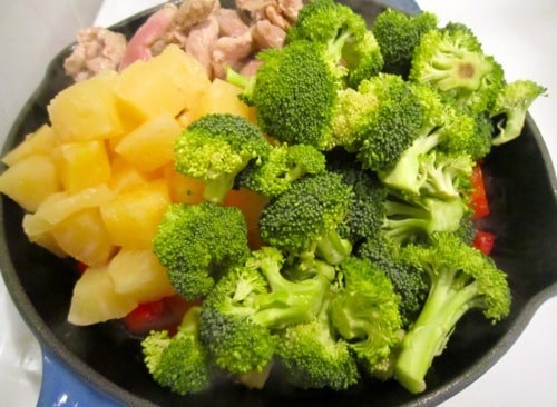 Whisk the sauce and add to pan along with the pork, broccoli and pineapple chunks.