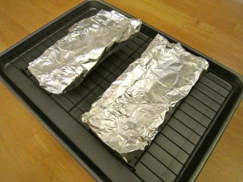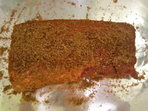 Place each slab of ribs on a piece of foil large enough to fold into a packet. Sprinkle the spice rub over the ribs, rubbing in thoroughly on all sides. With the ribs meat-side down, tightly fold the foil to form sealed packets.