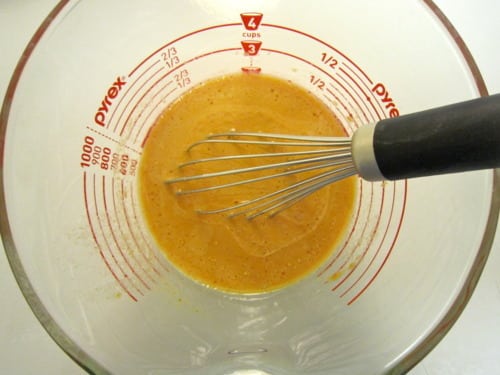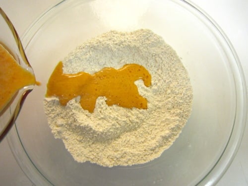 In a large glass measuring cup or another bowl, whisk together the milk, pumpkin puree, egg and oil (or butter, if using).