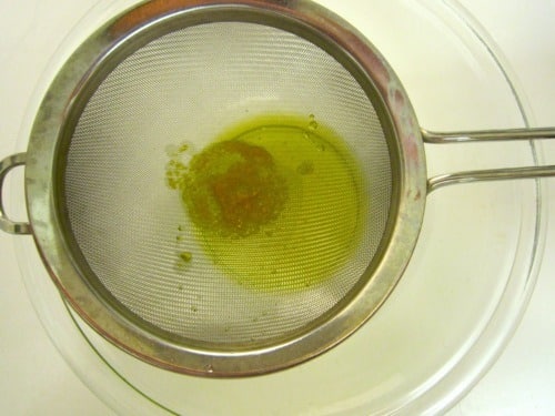 Using a mesh sieve, strain the lemon zest out of the reserved lemon olive oil and add the oil to the pasta. The zest can be discarded.