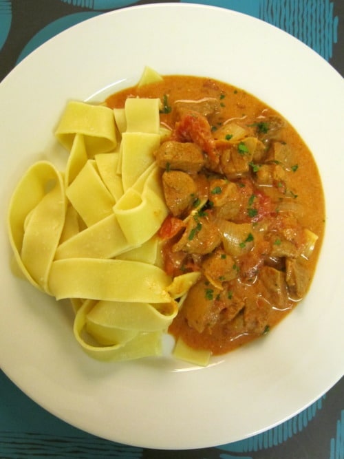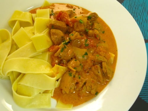 Serve paprikash over noodles, garnished with parsley, if desired.