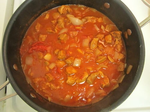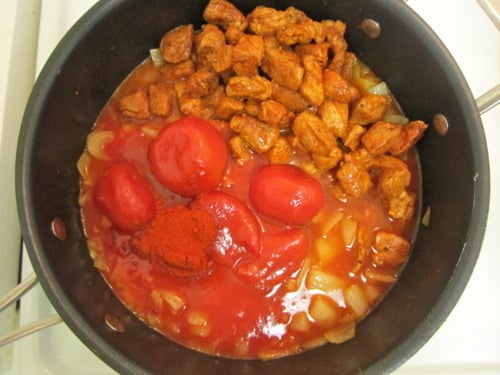 Add pork, remaining tablespoon paprika, tomatoes with their juice and 1/2 cup water.