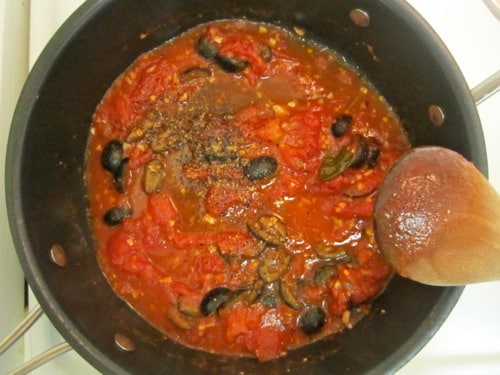 Add the tomatoes, olives, anchovies, capers, oregano, and red-pepper flakes.