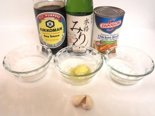 To make the glaze, whisk together the soy sauce, mirin, chicken broth, sugar, ginger and garlic in a small bowl; set aside. In another small bowl, whisk together the cornstarch and 3 tablespoons water; set aside.