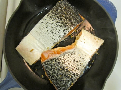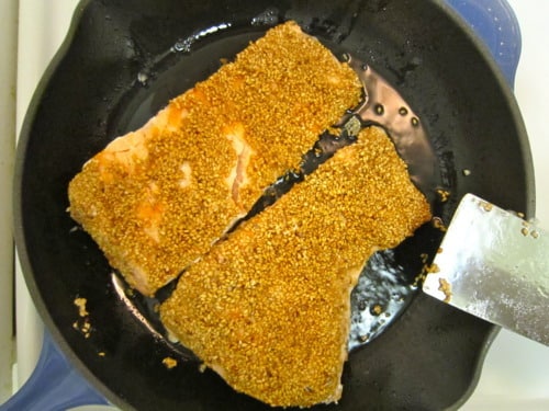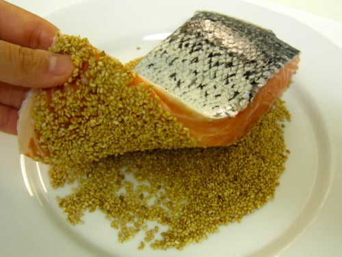 Heat vegetable or canola oil in a large skillet over medium-high heat. Place the salmon in the skillet, coated-side down, and cook until the sesame seeds are golden brown, about 5 minutes.
