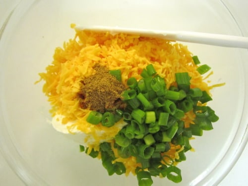In a medium bowl, combine the sour cream, 1 1/2 cups cheddar, green onions, cumin and cayenne pepper.