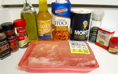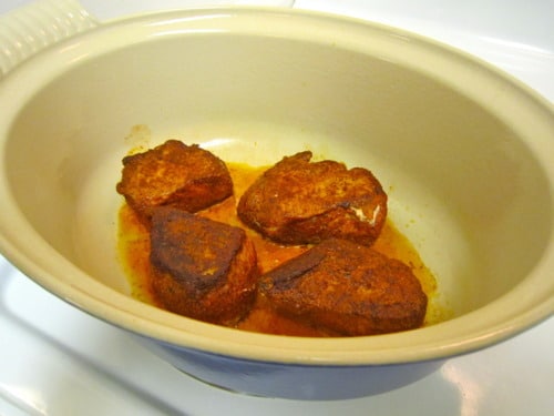 Heat olive oil in a large dutch oven over medium heat. Sear the pork in batches until brown, about 2-3 minutes on each side. Transfer to a plate.