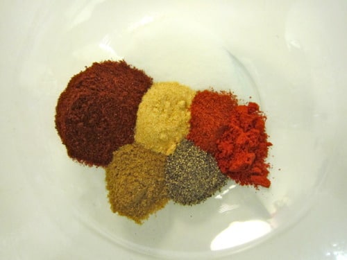 In a medium bowl, combine the chili powder, cumin, garlic powder, cayenne, paprika, salt and pepper; set aside.