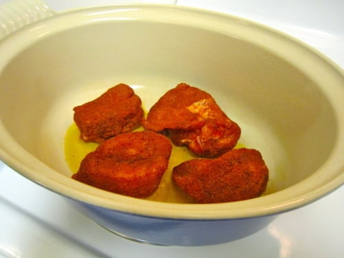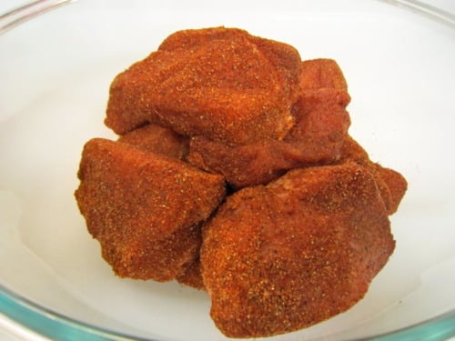 Coat each piece of pork with the spice mixture, rubbing gently into the meat with your fingers.