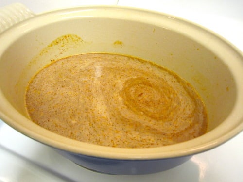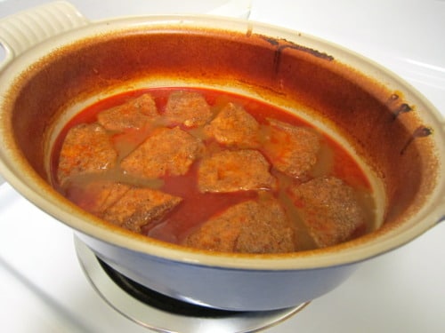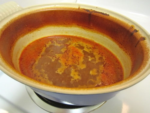 Simmer the remaining liquid over medium high heat; reduce for about 30 minutes. (You will want to skim as much fat off the top of the liquid as possible. It will reduce the greasiness of your carnitas.)