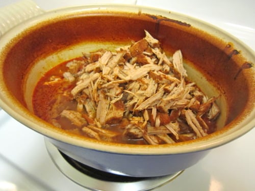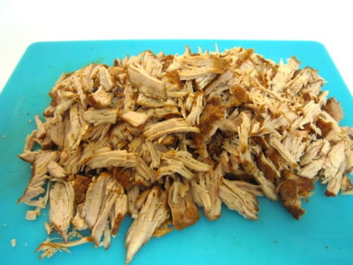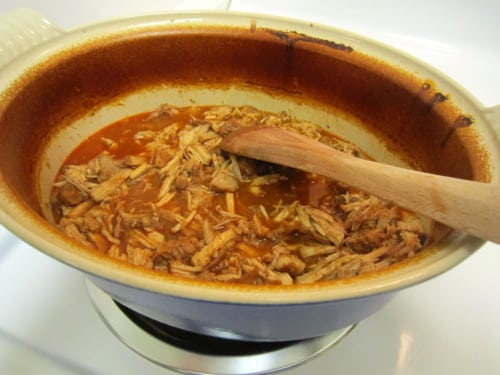 While the sauce is reducing, shred the pork with a fork, removing large pieces of fat.