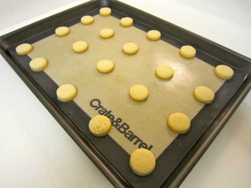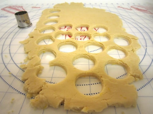 Use a 1-inch round cutter to cut out the cookies; press together the scraps of dough, and repeat process.