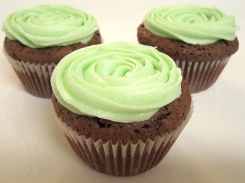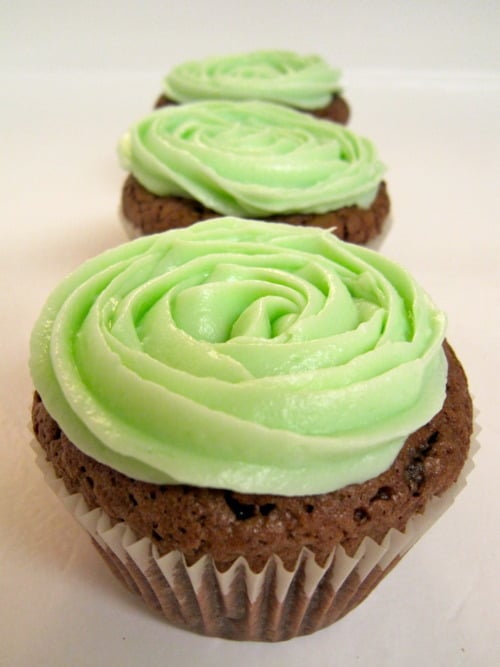I used the mixer for the first time for these brownie cupcakes. The batter was actually quite simply and didn’t even need the mixer so I ended up using the KitchenAid for the frosting only. I first used the whisk attachment because that’s how I made the vanilla cream cheese frosting for the Red Velvet Cupcakes I made not too long ago but it wasn’t quite working as I had hoped so I switched to the paddle attachment, which created a beautifully minty green frosting. It was the perfect complement for the brownies that had such enjoyable crisp edges with a cakey interior.