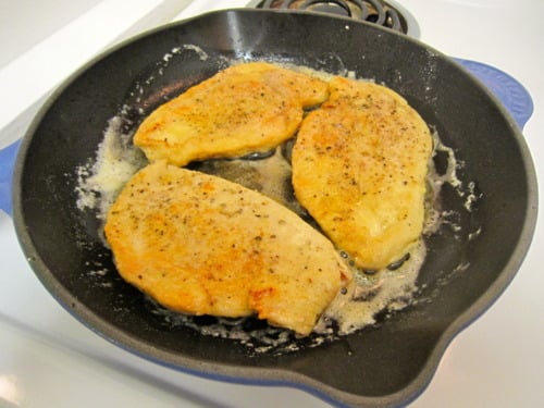 Heat the butter and olive oil in a large skillet over medium high heat. Add the chicken and cook, in two batches, until golden brown, about 3-4 minutes per side. Transfer to a plate.