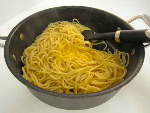 Every time Jason leaves for school in SF, I tend to become a temporary vegetarian. If I’m just cooking for one, I’m not going to buy a steak and grill it for myself. So when he’s gone, I like to make quick, simple meatless recipes like this one. It’s not only made with everyday ingredients but it’s the healthiest dinner I’ve ever made. It’s low in calories and it’s full of flavor! There’s a bit of a light creaminess from the raw egg yolks, a little bit of salt from the Parmesan, juicy, fresh flavors when you bite into the tomatoes, and a lasting refreshment from the basil. Now who says healthy food can’t be delicious?