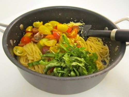Add the tomatoes and basil and gently toss to combine.