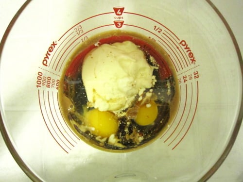 Add the sugars, buttermilk or plain yogurt, vegetable oil, eggs and vanilla.