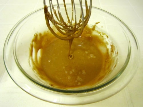 In a large glass measuring cup or another bowl, whisk together 1/4 cup hot water and espresso powder until the espresso powder dissolves.