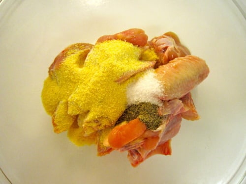 In a large bowl, combine the wings, corn flour, vegetable oil, 2 teaspoons salt and pepper.