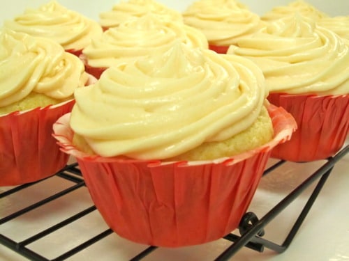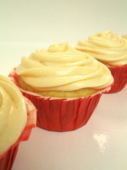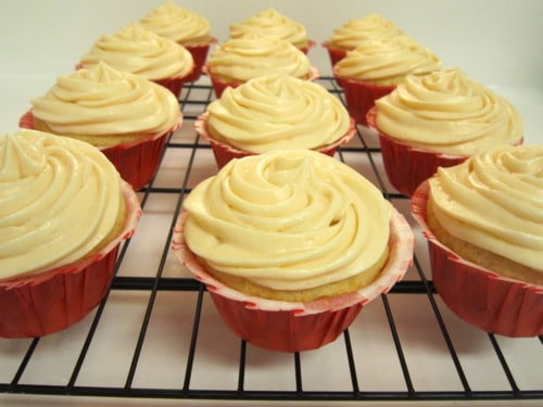 Use a small offset spatula to spread the cupcakes with frosting. (I piped the frosting using a large closed star tip.)