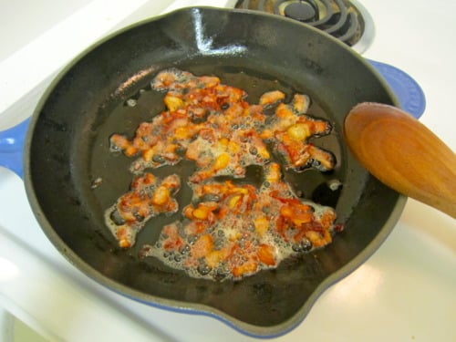 Heat a small skillet over medium high heat. Add the bacon and cook until brown and crispy, about 6-8 minutes. Transfer to a paper towel-lined plate, reserving the bacon fat.