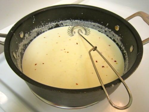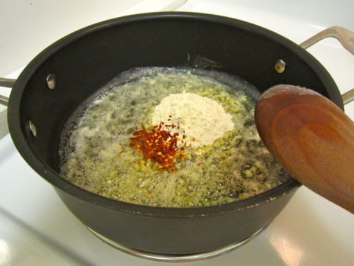 Whisk in the flour and red pepper flakes until the flour is lightly browned, about 1-2 minutes.