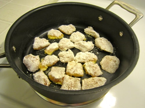 Place the cornstarch in a small bowl. Add the chicken and gently press to coat. (You want to apply a very thin dusting to both sides.) Let sit for about 10 minutes to allow the cornstarch to stick.