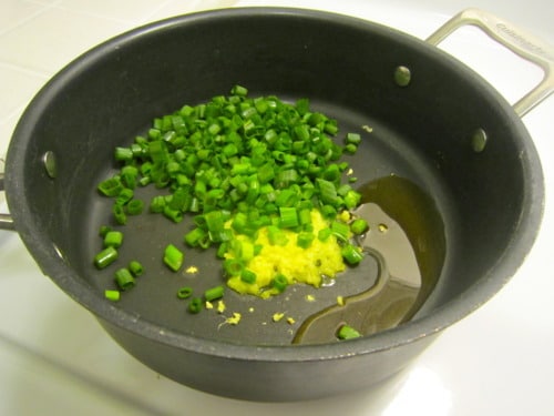 Wipe the skillet clean using a paper towel. Add the sesame oil, green onions and ginger. Cook, stirring constantly, until fragrant, about 30-60 seconds.