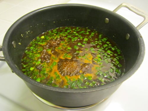 Serve immediately, garnished with green onions, hot pepper flakes, and sesame seeds.
