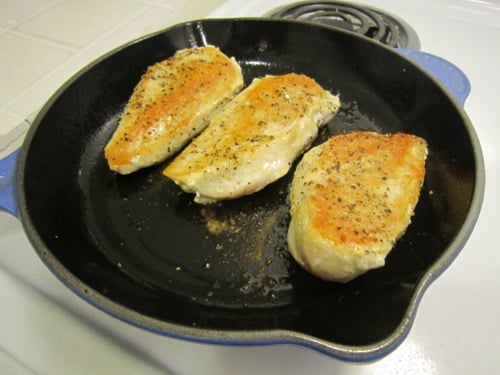 Heat the oil in a large skillet over medium high heat. Add the chicken and cook until golden brown, about 7-8 minutes per side.